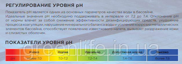 Для проведення ефективної дезінфекції води в басейні, важливо підтримувати певний рівень її pH. За норму прийнято показники в діапазоні від 7,2 до 7,6. Якщо вони відхиляться від норми, може виникнути ряд проблем: